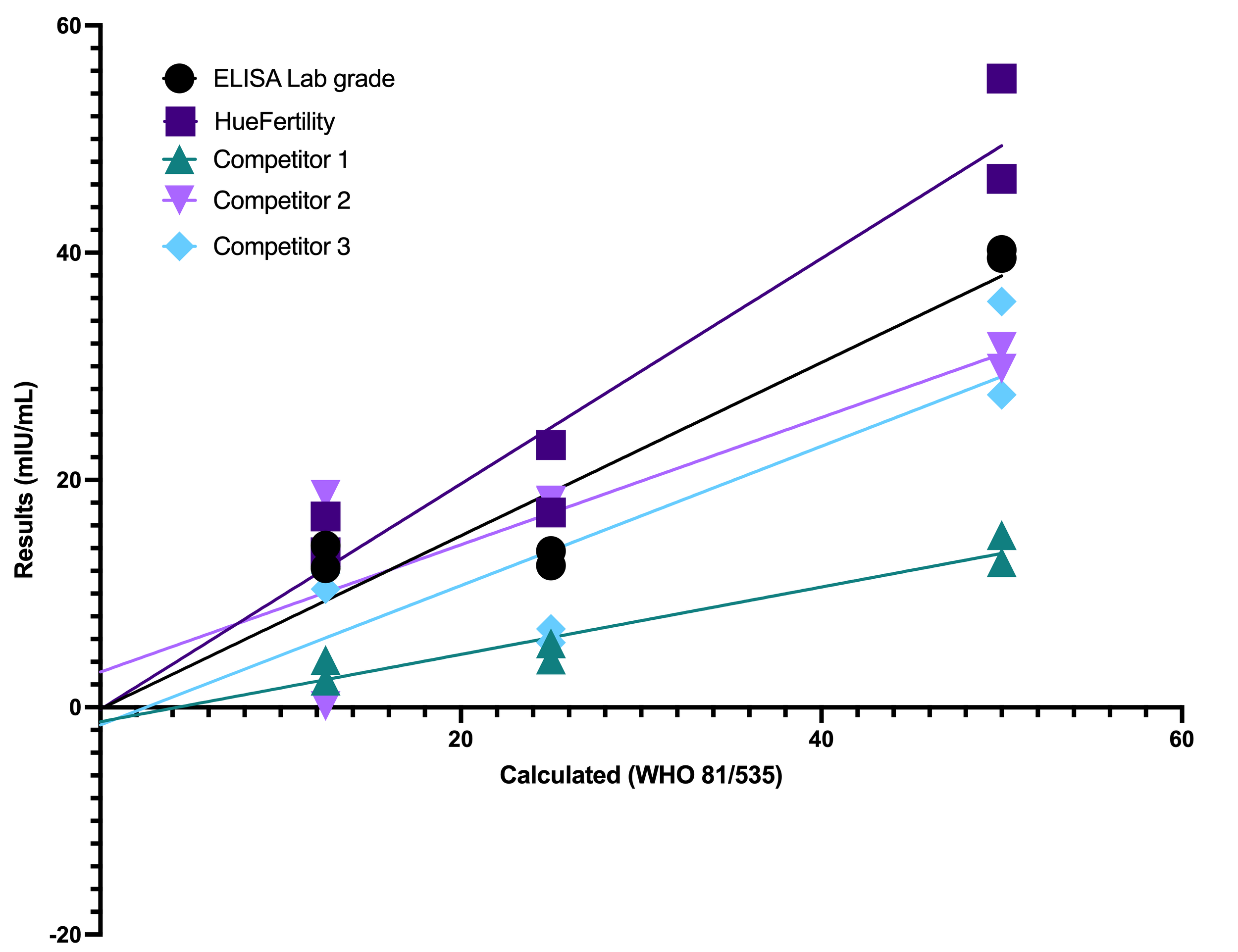 Only HueFertility maintains a linear, proportional relationship with ELISA, the hallmark of true quantitative accuracy.